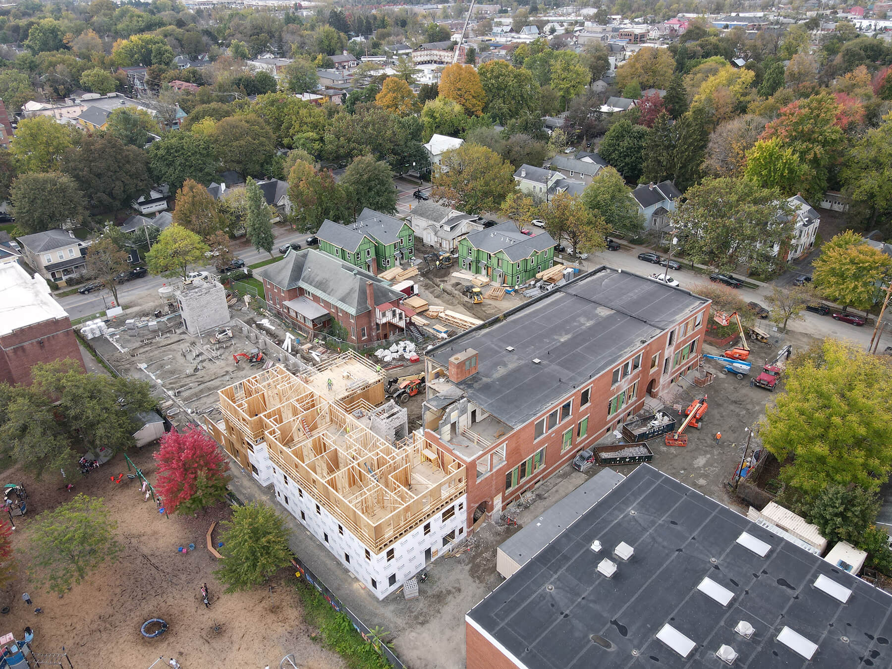 Neighborhood residents experienced some shaking during demolition of the old wing of the school due to the nature of soils in the downtown Ithaca area, but no damage to adjacent structures was reported and neighbors were consistently gracious and understanding of the challenges involved in undertaking a major construction project in a densely residential area. INHS is grateful to the community for their continued support of the project.